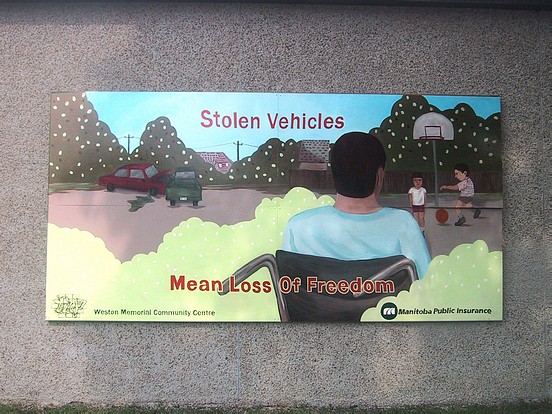 This unsigned piece was rendered by Julia Wake for the Weston Community Centre- one of a series of 5 Murals commissioned for Manitoba Public Insurance to send an anti-auto theft message to everyone, particularly youth. Julia was assisted by Weston Community Kids, with further facilitation by Graffiti Art Programming. The Mural was removed in 2015. Original notes follow: