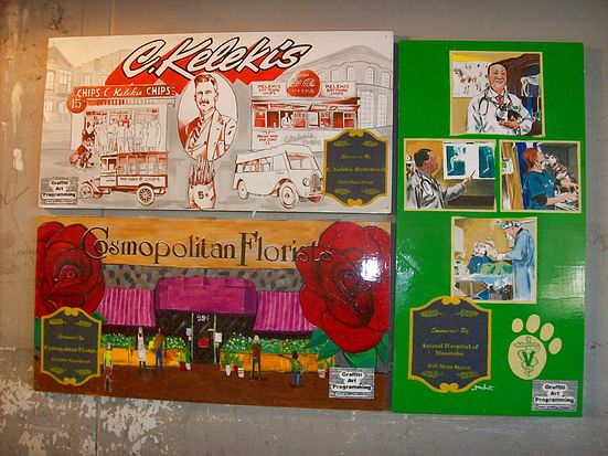 Kelekis Restaurant- by Cyrus Smith and Nereo Eugenio (both unsigned); Cosmopolitan Flowers- by Don Ritson (unsigned); Animal Hospital of Manitoba- by Cyrus Smith. Sponsorship for this grouping was by Mosaic Market BIZ, Neighbourhoods Alive! (Manitoba), Graffiti Art Programming, Kelekis Restaurant, Cosmopolitan Florists and Animal Hospital of Manitoba. This grouping was part of a larger collection of artwork which we show here in 11 sections rendered and installed in 2009. They were removed in 2014 to facilitate overhaul and reconstruction of the concrete underpass but were never reinstalled due to a different vision expressed for the underpass. Original notes follow: TJ Blair (Project Manager): "We worked closely with the Mosaic Market Business Improvement Zone to