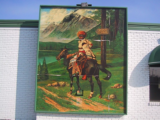 We were disappointed to lose Sergio Betto's 1999 rendering, but this photo from 2002 suggests why as it was weathering. Replaced in 2003 with a reproduction of the cover of Pony Corral's menu.