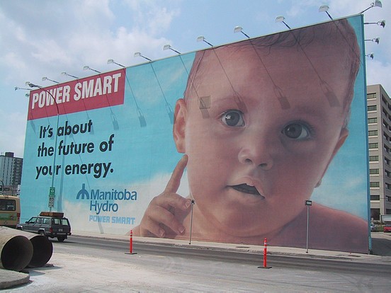 The Baby; practically a Winnipeg landmark! Signs and Wonders, 1999. Defaced in 2002 with duct and electrical tape by B. C. based environmental protesters who rappelled down the wall, also leaving scrapes and dents while they were clomping around. Replaced with a new Mural (see Murals section, same address).