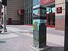 The very first Traffic controller box ever painted with artwork. The artwork (top half) was by Mike Valcourt; the bottom was by Tom Andrich; both in 2000 with sponsorship by Take Pride Winnipeg. The box was one of several removed from the street in 2011 as bigger boxes were required.