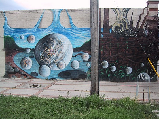 This Mural was rendered by Mike Johnston in 2000 for the then client and tenant, Genesis Bookstore. It was replaced in September 2004 with a new Mural for a new tenant (see Murals section, same address).
