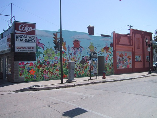 This 2005 rendering was the last of 3 incarnations of this wall for Broadway Pharmacy. Arts were Art City Youth and Wanda Koop. Additional sponsors were Take Pride Winnipeg (wall prep) and Colour Scheme Professionals (base coat).The artwork was lost in 2018 when the wall resurfaced in 2018 for a new occupant.