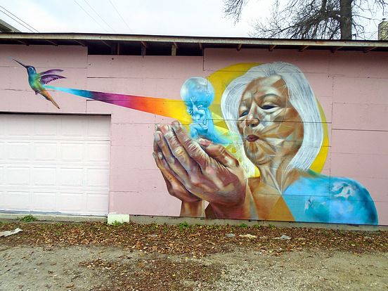 'Gaia" This artwork was rendered by Nereo Eugenio (Nereo II) in 2016 as part of that year's Mural and Culture Festival organized by Synonym Art Consultation and Graffiti Arts Programming. It was lost in 2021 when this rear outbuilding was demolished.
