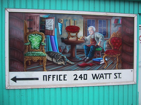 This 2002 photo of the beautiful Dan Sawatsky rendering for Transcona BIZ in 1991. The 2010 restoration of this Mural by Tom Andrich may be seen in photo 2.
