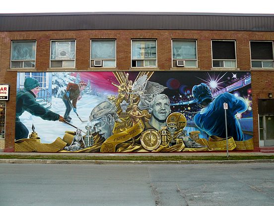 female figures support scrolls of prolific players from Manitoba's hockey