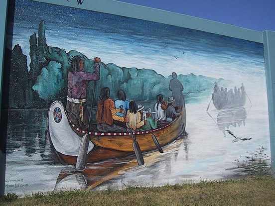 Jennifer: "We wanted to give it a watercolor feel that's why we have the range of colors in the background and showing people coming to a new land being transported by indigenous people. It's a caravan type of idea. Originally we would've liked to put a third canoe off to in the distance but the length of the wall didn't allow it. We added some things; you've got the seagull happening and the plant life off in the corner and the fog with the front man in the boat disappearing off into the distance. The people on the right are a lot more muted, with the disappearance of perspective."