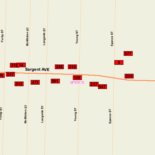 Location: slightly North of the NE corner Spence & Sargent; North (rear) Face