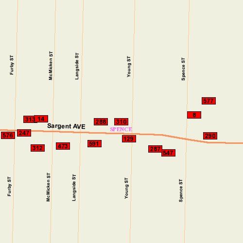 Location: slightly North of the NE corner Spence & Sargent; North (rear) Face