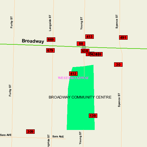 Location: East Side South of Broadway; playground building; access from back lane to Balmoral; North Face