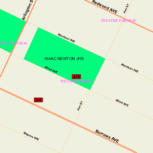 Location: visible from Alfred Avenue entrance between Parr & Arlington; South Face