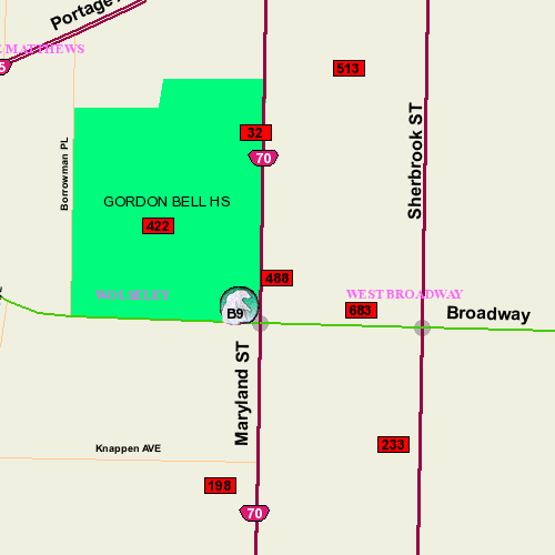 The Bear was relocated to the West side of the Manitoba Public Insurance Building at 1075 Portage Avenue (photos 1 & 2). In 2011 the Bear was relocated to its permanent location at the NW corner of Maryland & Broadway, inside the schoolyard of Gordon Bell High School (Photo 3).