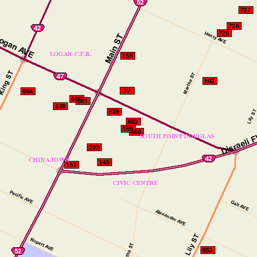 Location: visible from inbound Disraeli bet. Logan and Main; East Face (rear)