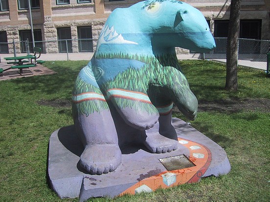 This Bear is now located in front of Luxton School at 111 Polson Avenue.