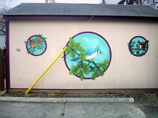 This artwork is visible from the back alley on the shed there facing the lane. It was rendered by Tom Jones in 2005.